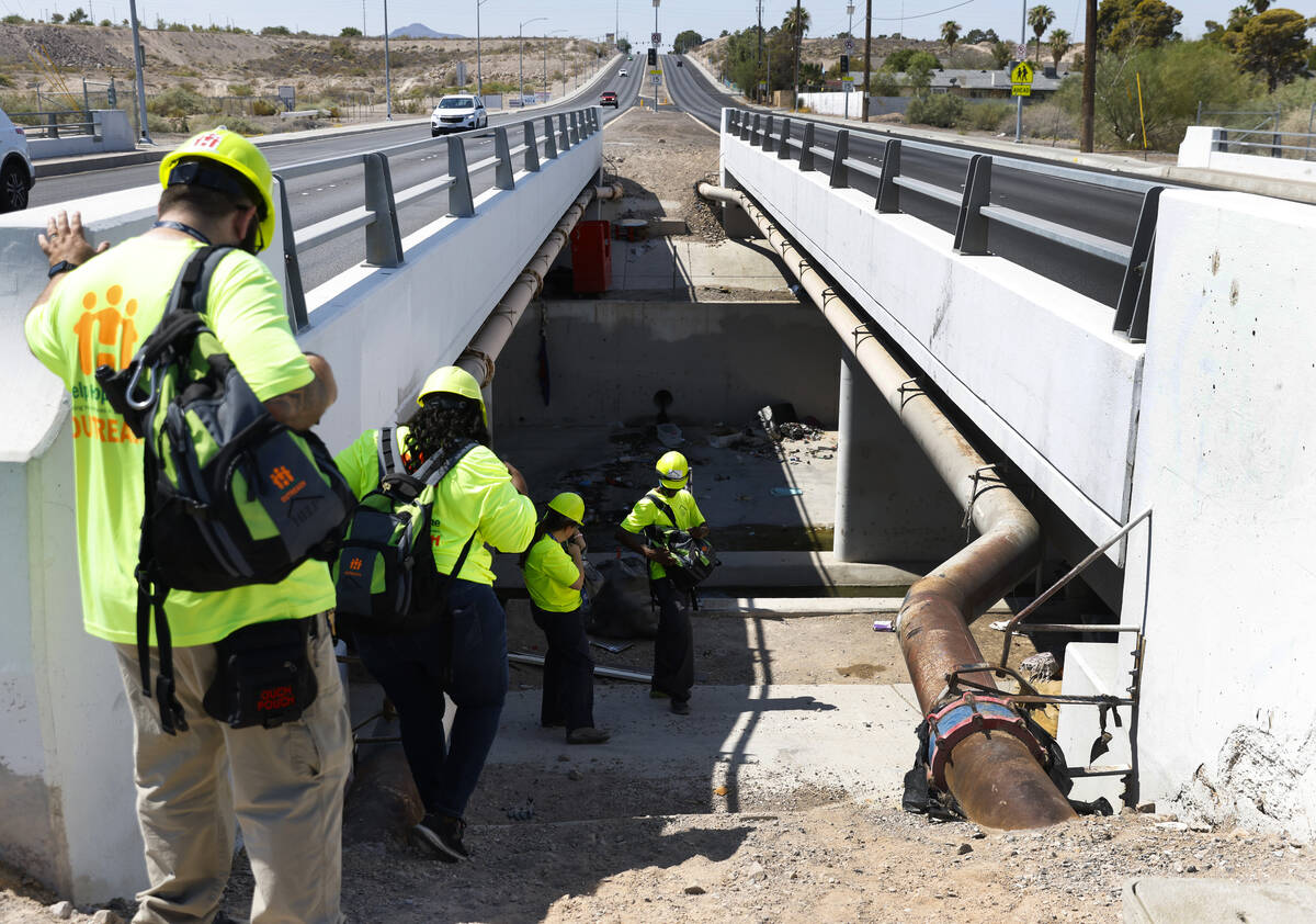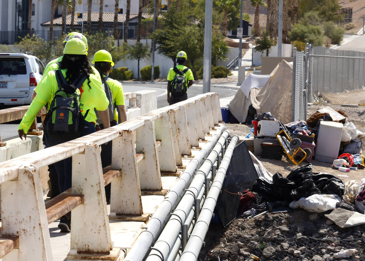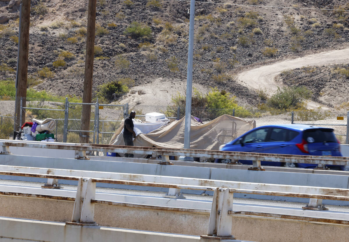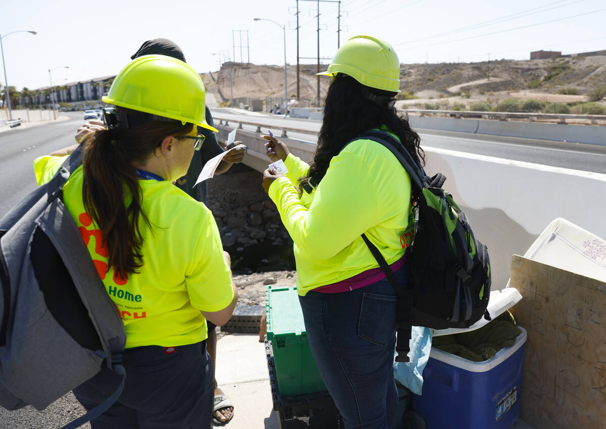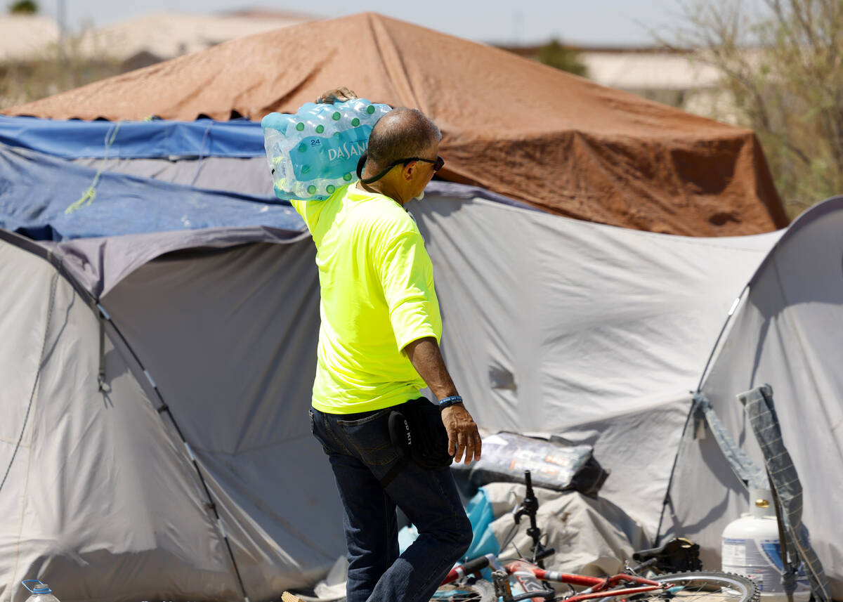 Derryl Walker has been homeless for 12 years and has lived under the bridge by Mountain Vista Street and East Russell Road for about a year. He accepted water bottles from HELP but told the Review-Journal he does not typically go to established cooling centers or shelters, choosing instead to go to local businesses where he has established good relationships with the owners.