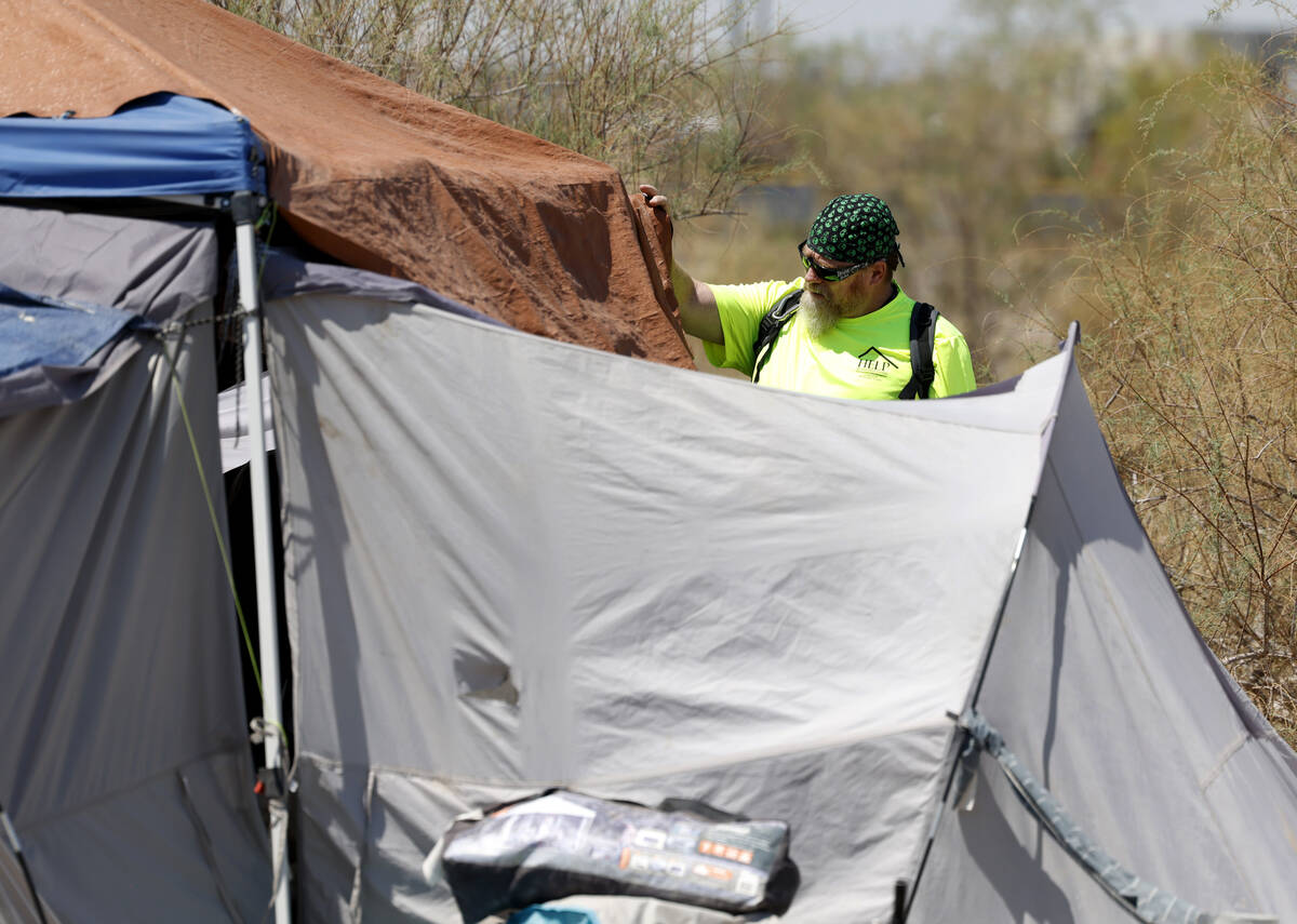 Homeless since 2017, Erik Smith dug a hole in the sand where he set up a tent for his shelter. He has had difficulty obtaining a Nevada ID because of misplacing his documents. HELP workers noted that they can help him with that problem.