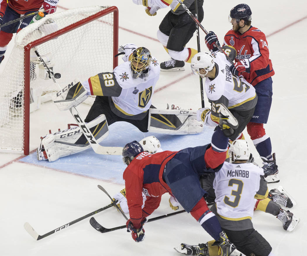 Capitals left wing Alex Ovechkin (8) scores a second-period goal against Golden Knights goaltender Marc-Andre Fleury (29) during Game 3 of the NHL Stanley Cup Final on Saturday, June 2, 2018, at Capital One Arena, in Washington. Benjamin Hager Las Vegas Review-Journal @benjaminhphoto