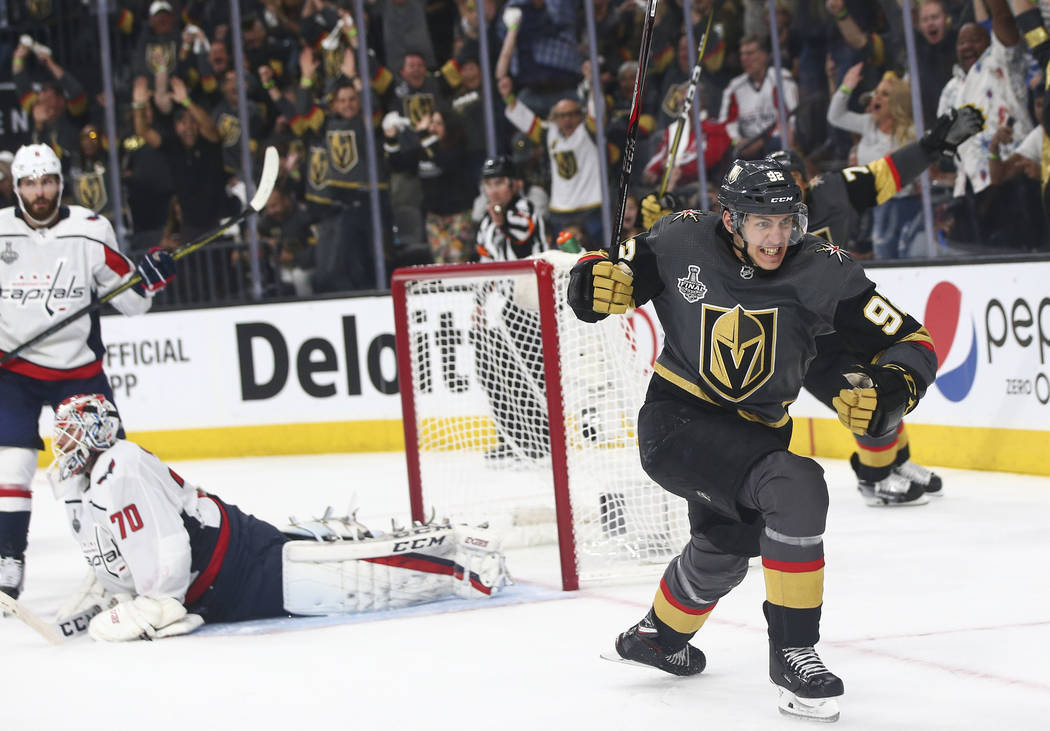 Golden Knights left wing Tomas Nosek (92) celebrates his goal against the Washington Capitals during the third period of Game 1 of the NHL hockey Stanley Cup Final at the T-Mobile Arena in Las Vegas on Monday, May 28, 2018. Chase Stevens Las Vegas Review-Journal @csstevensphoto
