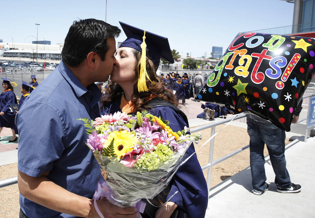Christie Macchione of Upland Calif., kisses her boyfriend David Rodriguez after receiving her diploma during the master’s degree graduation ceremony of Western Governors University of Nevada at the Thomas & Mack Center on Saturday, June 2, 2018, in Las Vegas. Bizuayehu Tesfaye/Las Vegas Review-Journal @bizutesfaye
