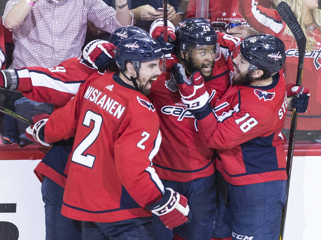 Capitals defenseman Matt Niskanen (2), right wing Devante Smith-Pelly (25) and center Chandler Stephenson (18) celebrate after Smith-Pelly scored a third-period goal during Game 3 of the NHL Stanley Cup Final against the Golden Knights on Saturday, June 2, 2018, at Capital One Arena, in Washington. The Capitals beat the Golden Knights 3-1. Benjamin Hager Las Vegas Review-Journal @benjaminhphoto