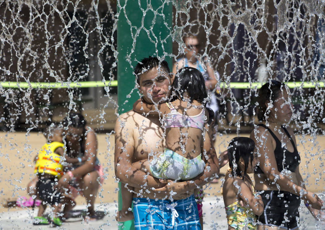 Las Vegas resident Javier Rosete holds his five-year-old daughter, Janet, under a water feature at the outdoor water park at Desert Breeze Aquatic Center in Las Vegas on Sunday, June 3, 2018. Richard Brian Las Vegas Review-Journal @vegasphotograph
