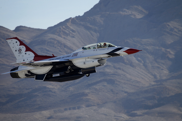 A U.S. Air Force F-16 assigned to the Las Vegas-based Thunderbirds demonstration team landed without incident in New Mexico Thursday after reporting an engine problem.