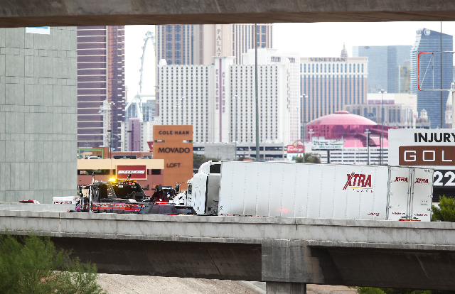 A tow truck driver hauls a tractor-trailer that hit a wall on the ramp from southbound U.S. Highway 95 to southbound Interstate 15 in Las Vegas on Tuesday, Sept. 15, 2015. Chase Stevens/Las Vegas Review-Journal Follow @csstevensphoto