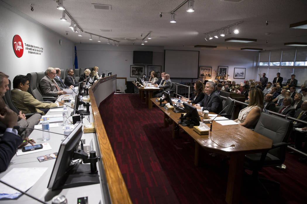 Four board members — casino industry representatives Chuck Bowling of MGM Resorts International, Tom Jenkin of Caesars Entertainment and Maurice Wooden of Wynn Resorts — and Henderson Councilman John Marz didn’t attend the meeting.