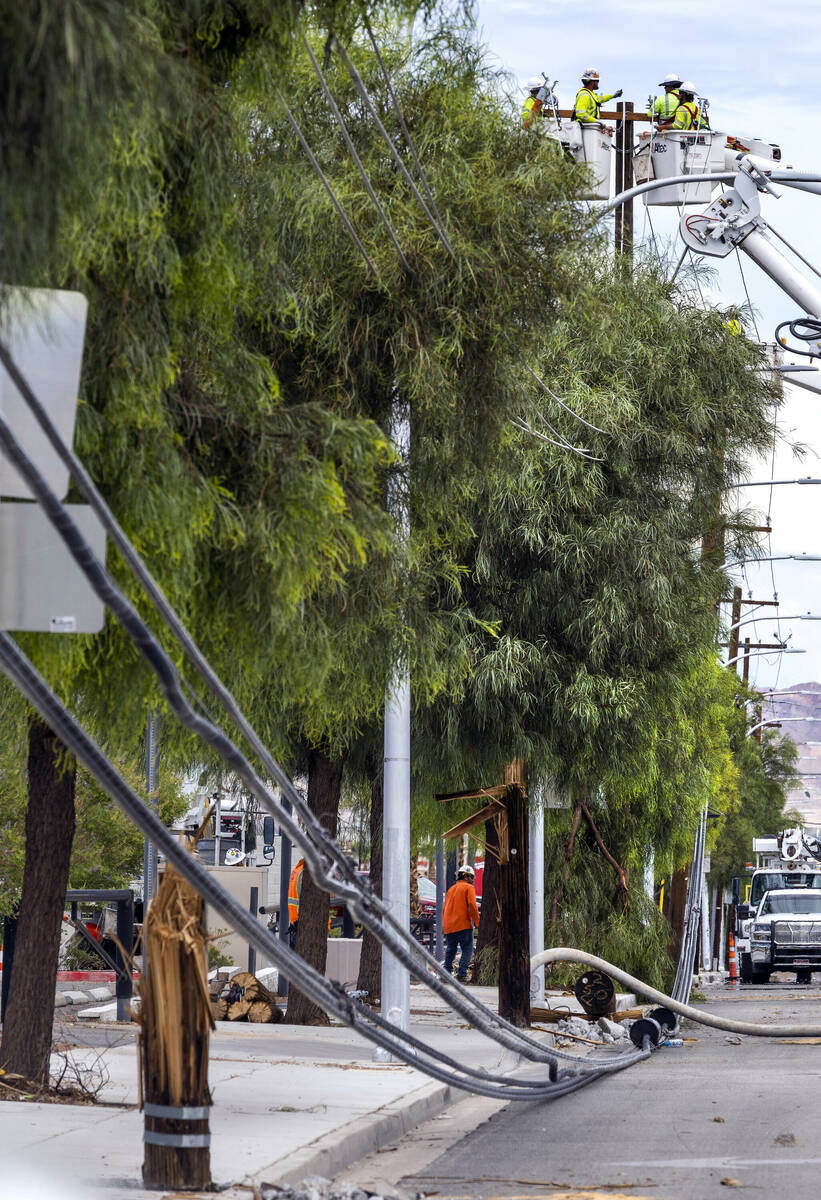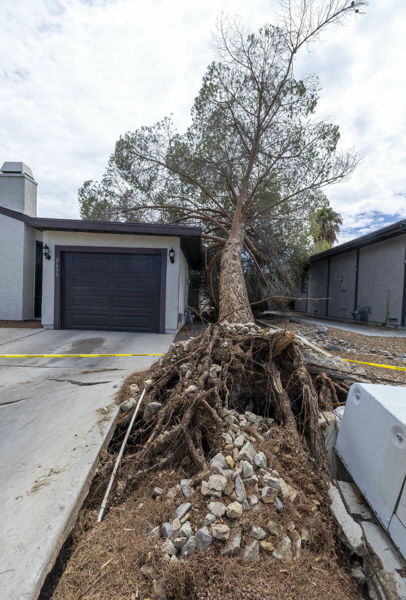 Clark County firefighters responded at 10:08 p.m. to 2680 Atlantic St., near East Karen Avenue, after heavy rain, wind and lightning caused several large trees to blow into vehicles and buildings on the property.