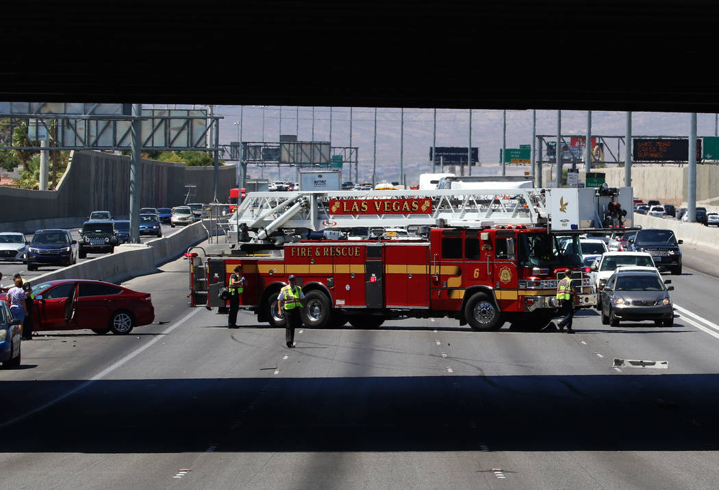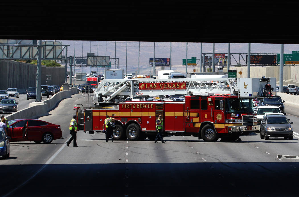 Las Vegas firefighters at the scene of multi-vehicle crash at US Highway 95 southbound near Decatur Boulevard exit on Wednesday, Aug. 28, 2019, in Las Vegas. (Bizuayehu Tesfaye/Las Vegas Review-Journal) @bizutesfaye
