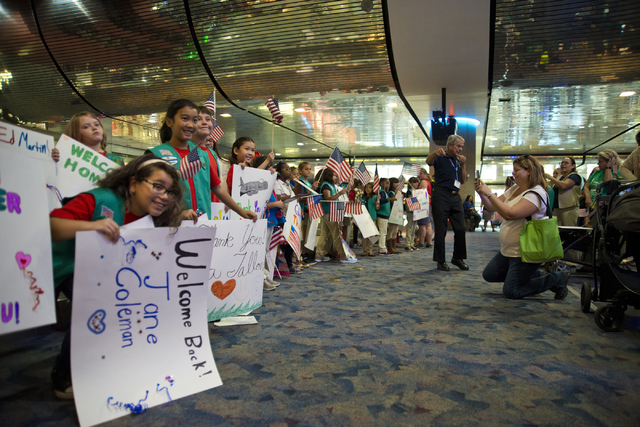 On Sunday, between 300 and 400 people, including several Girl Scout and Boy Scout troops, lined up on the second level of McCarran’s Terminal 1, holding American flags and colorful welcome home signs, to show their appreciation.