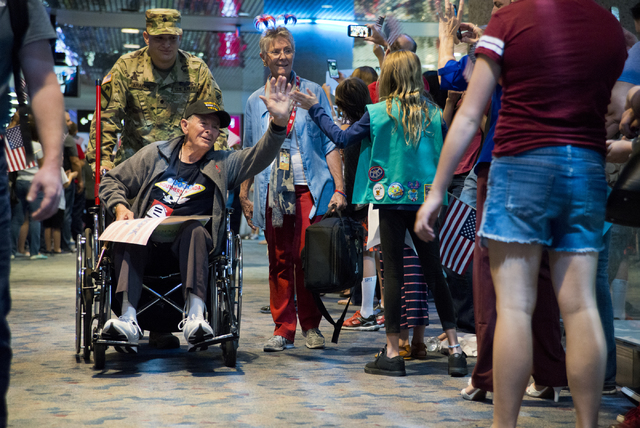 Amid the clapping, cheering, hand shaking and flag waving, some tears were shed Sunday afternoon at McCarran International Airport as 25 World War II and four Korean War veterans were given a warm welcome on their return home from a weekend trip to Washington, D.C.