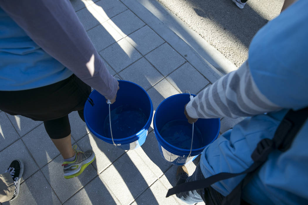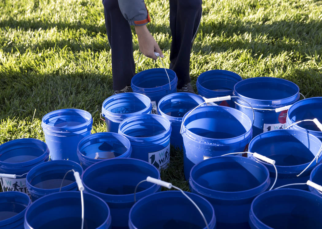 Participants carry buckets of water before the start of One Drop's 2.7-mile Walk for Water fun walk from Symphony Park at The Smith Center to the Springs Preserve in Las Vegas, Saturday, Oct. 21, 2017. Richard Brian Las Vegas Review-Journal @vegasphotograph