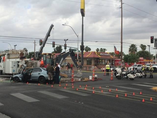 A woman in a stolen car crashed into a construction site, injuring two workers at the intersection of Charleston Boulevard and Eastern Avenue Thursday morning, Las Vegas police said.