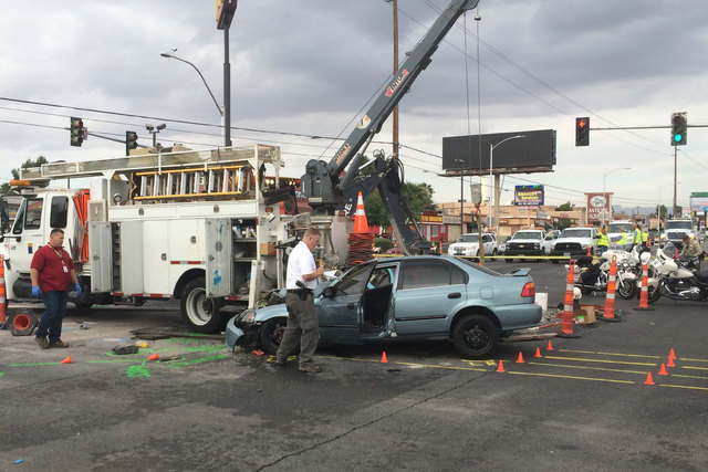 The two Las Vegas Valley Water District employees were taken to University Medical Center with several broken bones after the woman crashed a Honda sedan into them and a work truck about 3:40 a.m.