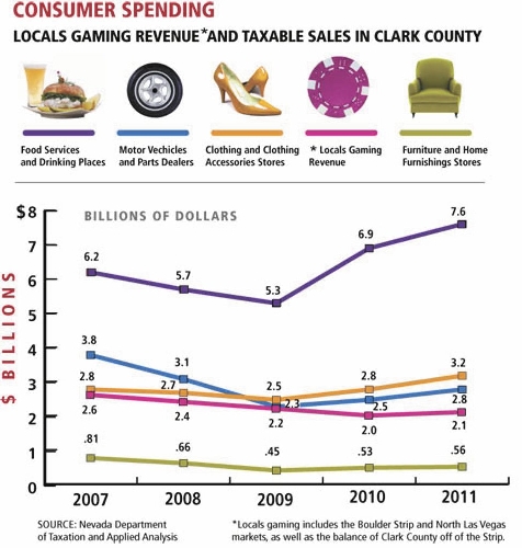 If you need more evidence the city looks more normal these days, consider how much locals spend gambling. From 2009 to 2011, spending rose 12 percent on cars, 23.8 percent on furniture, 28 percent on clothes and 43.4 percent on meals out. On locals gaming, spending fell 4.5 percent in the period. From 2010 to 2011, locals gambling ticked up 1.6 percent, while all taxable sales categories in the county rose 6.3 percent.