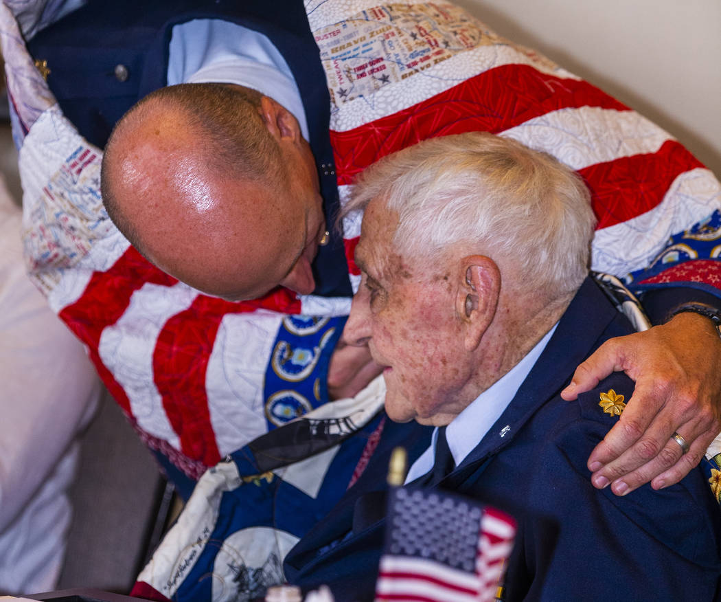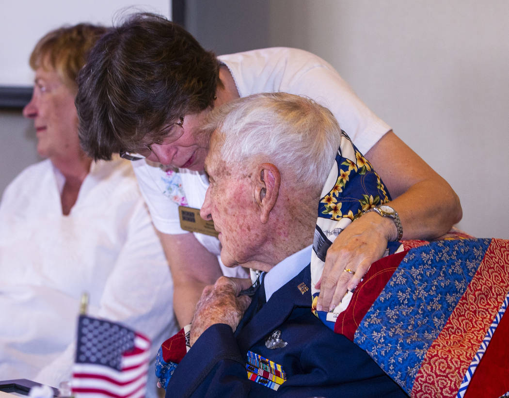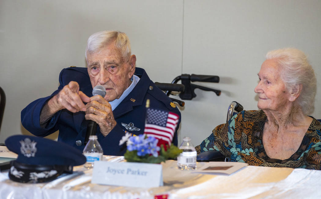 Parker was presented Saturday with a glass case displaying the medals he earned during his service, including the Air Force Commendation Medal and the Distinguished Flying Cross. Samantha Bivins from Horsford’s office awarded him with the first monthly “Horsford Hero” award for veterans. Two women from the Quilt of Valor organization presented him a handmade quilt depicting ships and aircraft at Pearl Harbor on Dec. 7, 1941.