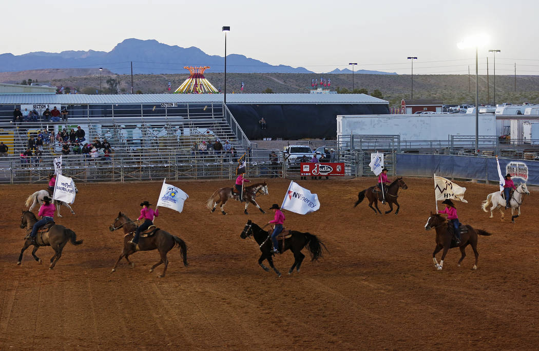 Cowgirls ride around before the start of the Clark County Fair & Rodeo in Logandale, Thursday, April 12, 2018. Andrea Cornejo Las Vegas Review-Journal @dreacornejo
