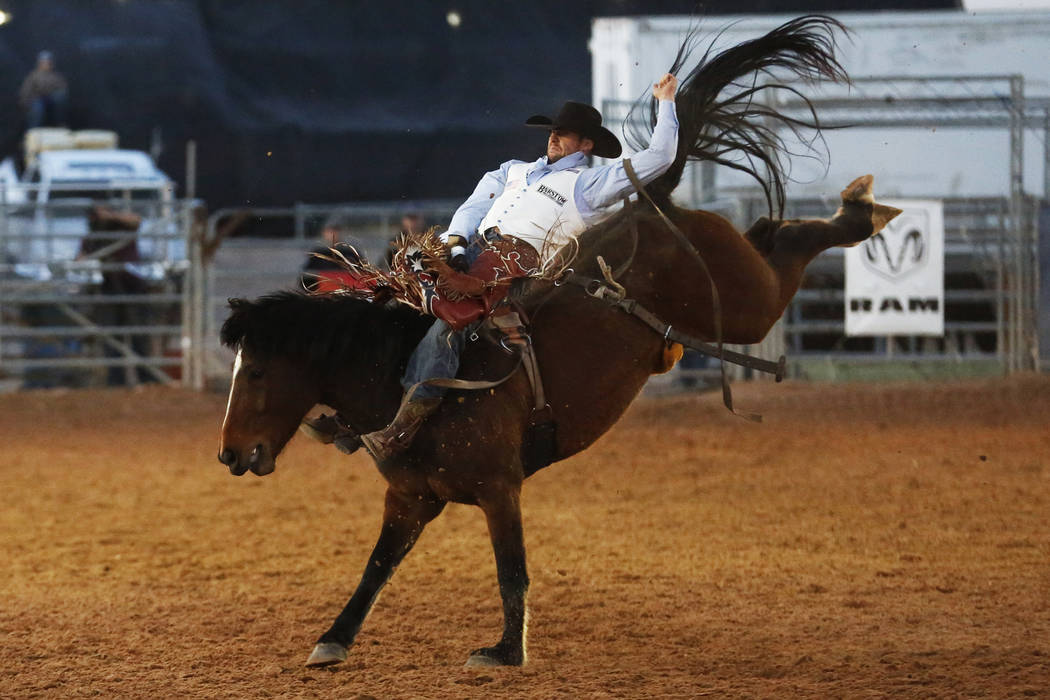 A participant competes in a bronc riding competition during the Clark County Fair & Rodeo in Logandale, Thursday, April 12, 2018. Andrea Cornejo Las Vegas Review-Journal @dreacornejo
