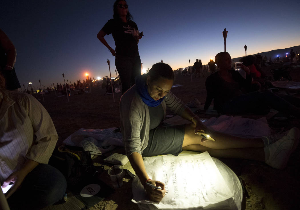 Scattered throughout the festival, people did just that. They danced barefoot in the desert, munched on Sin City Pizza and lay on their stomachs, scribbling messages on lanterns.