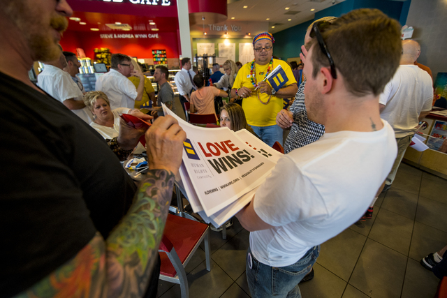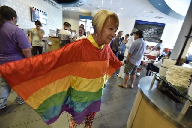 About 400 people — some waving rainbow flags, holding signs and wearing shirts in support of the decision — packed the Gay and Lesbian Community Center of Southern Nevada for a celebration rally Friday afternoon.