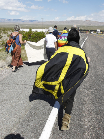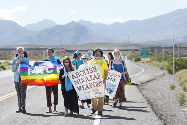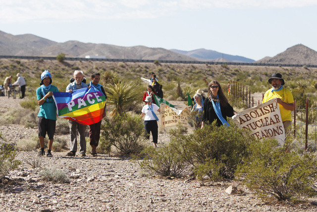 Anti-nuclear weapons demonstrators march toward the Nevada National Security Site during a civil disobedience action marking the United Nations International Day of Peace Sunday, Sept. 21, 2014. Fourteen people participated in the action sponsored by the Nevada Desert Experience and 11 crossed the line to the site and were detained. (Sam Morris/Las Vegas Review-Journal)