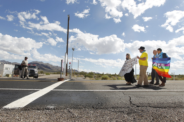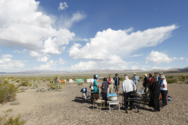 Anti-nuclear weapons demonstrators gather outside the Nevada National Security Site during a civil disobedience action marking the United Nations International Day of Peace Sunday, Sept. 21, 2014. Fourteen people participated in the action sponsored by the Nevada Desert Experience and 11 crossed the line to the site and were detained. (Sam Morris/Las Vegas Review-Journal)