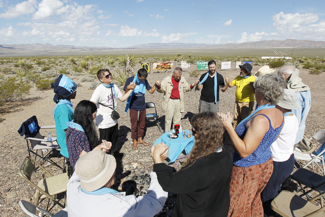 Anti-nuclear weapons demonstrators say a blessing outside the Nevada National Security Site during a civil disobedience action marking the United Nations International Day of Peace Sunday, Sept. 21, 2014. Fourteen people participated in the action sponsored by the Nevada Desert Experience and 11 crossed the line to the site and were detained. (Sam Morris/Las Vegas Review-Journal)