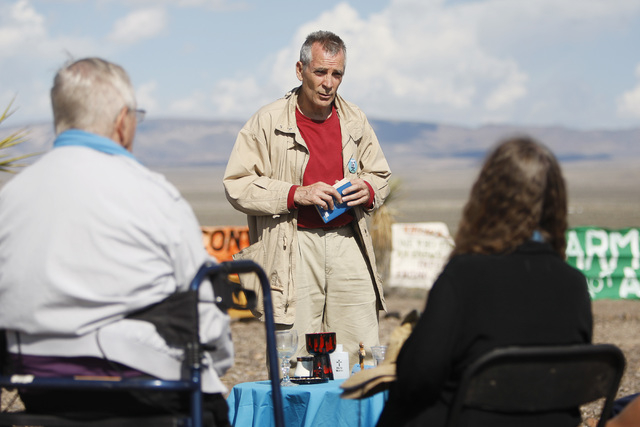 Steve Kelly says Mass for anti-nuclear weapons demonstrators outside the Nevada National Security Site during a civil disobedience action marking the United Nations International Day of Peace Sunday, Sept. 21, 2014. Fourteen people participated in the action sponsored by the Nevada Desert Experience and 11 crossed the line to the site and were detained. (Sam Morris/Las Vegas Review-Journal)