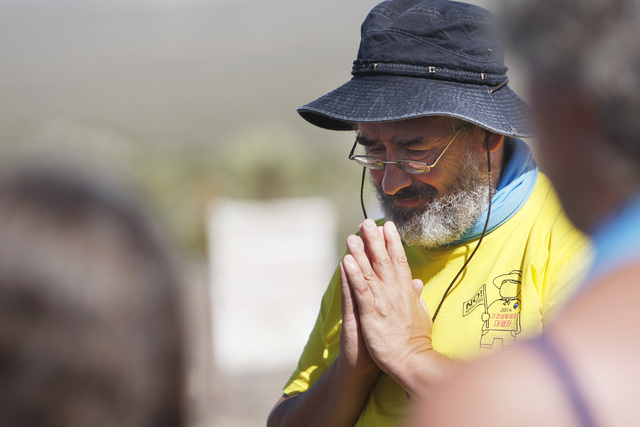Brian Terrell from Maloy, Iowa, prays with other anti-nuclear weapons demonstrators outside the Nevada National Security Site during a civil disobedience action marking the United Nations International Day of Peace Sunday, Sept. 21, 2014. Fourteen people participated in the action sponsored by the Nevada Desert Experience and 11 crossed the line to the site and were detained. (Sam Morris/Las Vegas Review-Journal)