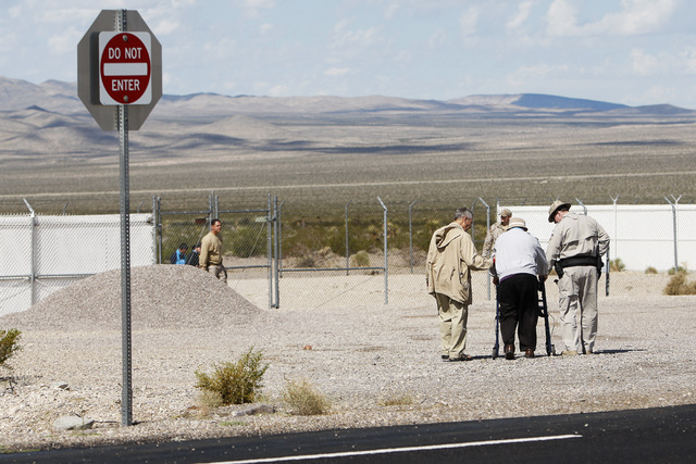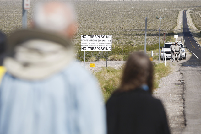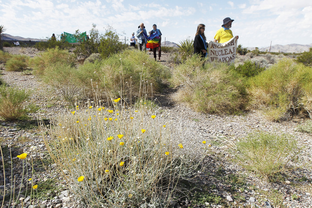 Anti-nuclear weapons demonstrators approach the Nevada National Security Site during a civil disobedience action marking the United Nations International Day of Peace Sunday, Sept. 21, 2014. Fourteen people participated in the action sponsored by the Nevada Desert Experience and 11 crossed the line to the site and were detained. (Sam Morris/Las Vegas Review-Journal)