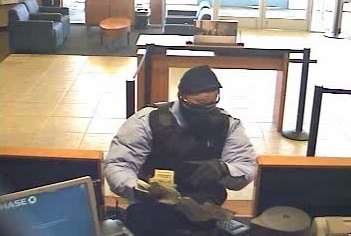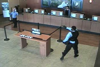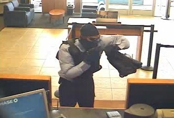 The robber was last seen wearing a ballistic vest over a light blue, long-sleeved shirt with heavy padding, black pants, boots, gloves, a mask, a hood and sunglasses.