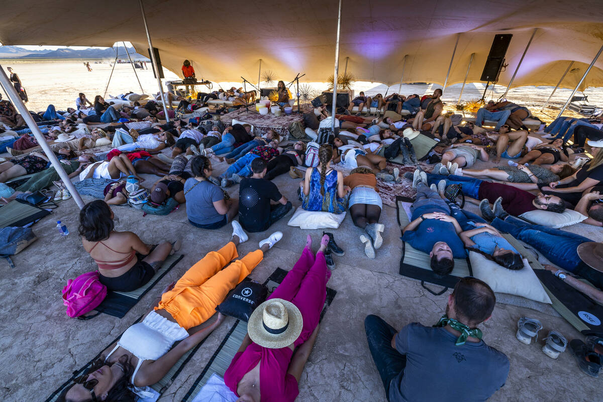 Participants take in a soundbath meditation during the RiSE Lantern Fest at the Jean Dry Lake Bed on Friday, Oct. 7, 2022, in Jean. (L.E. Baskow/Las Vegas Review-Journal) @Left_Eye_Images
