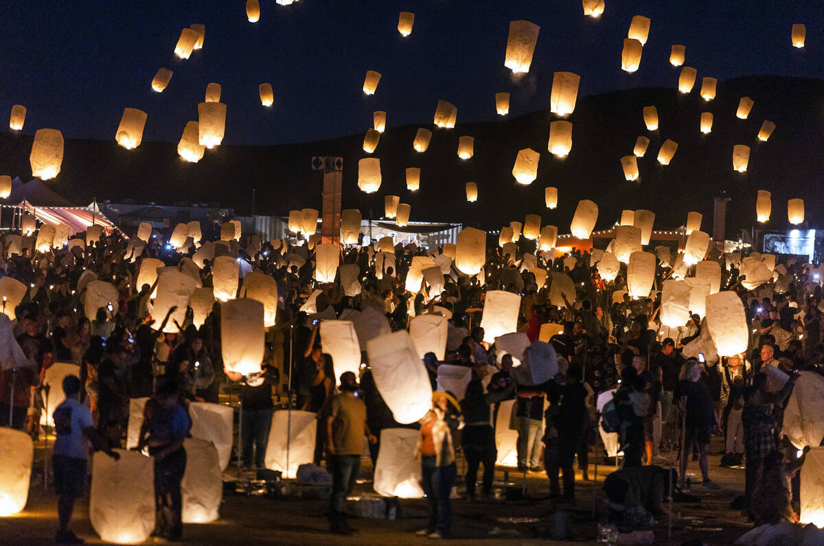 People release lanterns as a group during the RiSE Lantern Fest at the Jean Dry Lake Bed on Friday, Oct. 7, 2022, in Jean. (L.E. Baskow/Las Vegas Review-Journal) @Left_Eye_Images