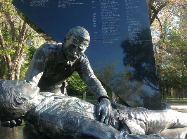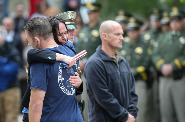 CARSON CITY - Scores of law enforcement officers from around Nevada gathered on the Capitol grounds Thursday to pay respect to their fallen comrades, including Las Vegas Metropolitan Police Officers Alyn Beck and Igor Soldo, ambushed and fatally wounded in June 2014 while they ate lunch.