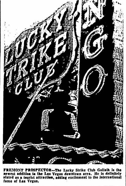 The statues’ first home was the Lucky Strike Club on Fremont Street in 1954. A Review-Journal report from the casino’s opening says the 12-foot figures stood on either side of the club’s Fremont sign, and were once “mechanized to allow the miner to go through the motion of gold panning.”