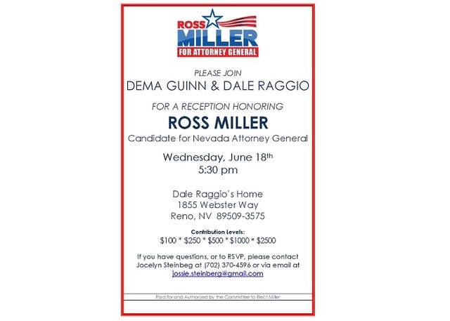 On Wednesday in Reno, the widows of two GOP icons in Nevada, the late Gov. Kenny Guinn and the late state Sen. Bill Raggio, R-Reno, are holding a fundraiser for Secretary of State Ross Miller, a Democrat running for attorney general. It will be held at Dale Raggio’s home and Dema Guinn is the co-host. Contribution levels were $100, $250, $500 and $1,000.