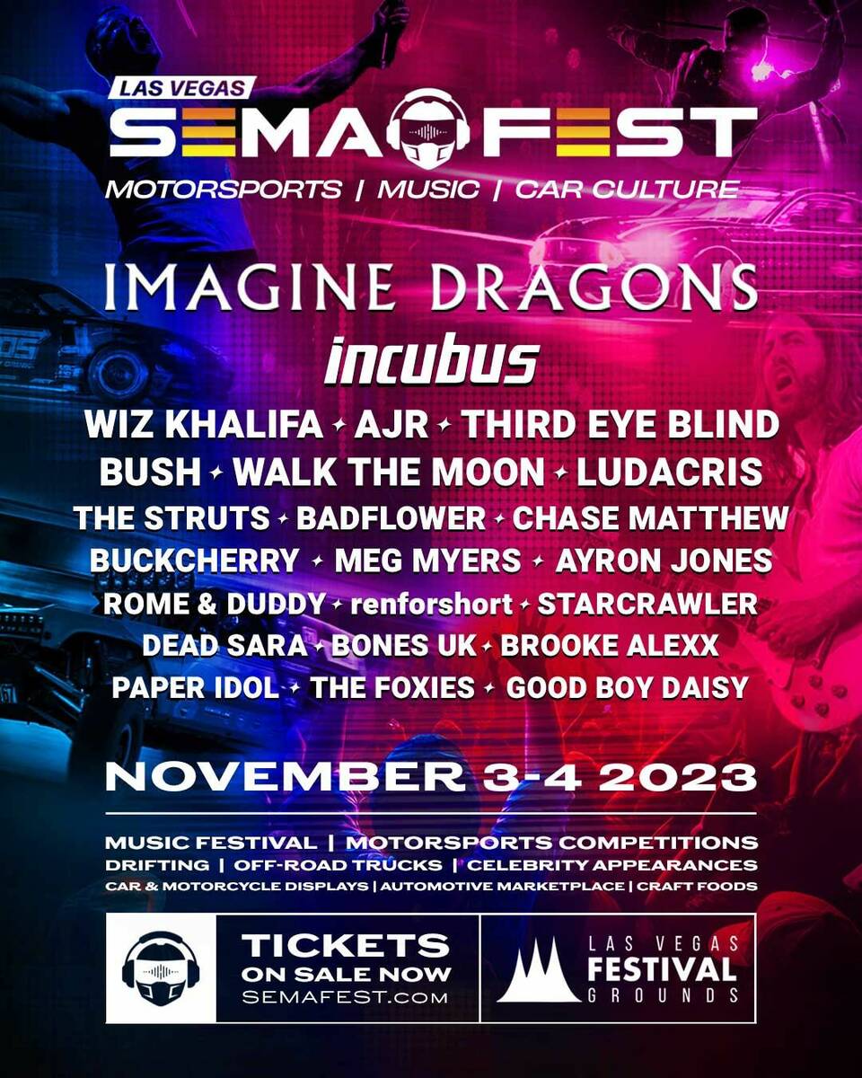 Set to debut Nov. 3-4 at the Las Vegas Festival Grounds, SEMA Fest will be headlined by Vegas’ own Imagine Dragons, and will also include rockers Incubus, Bush and Third Eye Blind, hip-hoppers Wiz Khalifa and Ludacris indie popsters AJR, country singer Chase Matthews, singer-songwriter Meg Myers and numerous others.