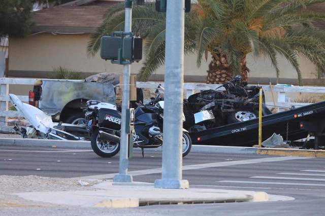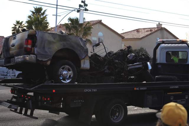 North Las Vegas police spokesman Aaron Patty said about 1:30 a.m. a Ford F-150 truck crashed into a traffic pole and caught fire at the intersection of Alexander Road and Decatur Boulevard.