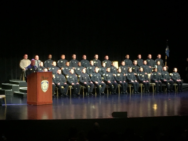 Dozens of family members and friends cheered and applauded for the graduates. One family’s joyful whoops were loud enough to shake the room. After the ovations came presentations — the pinning of police badges.