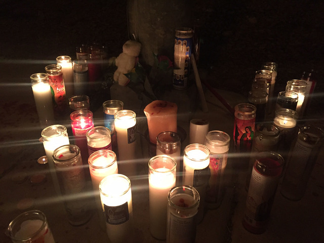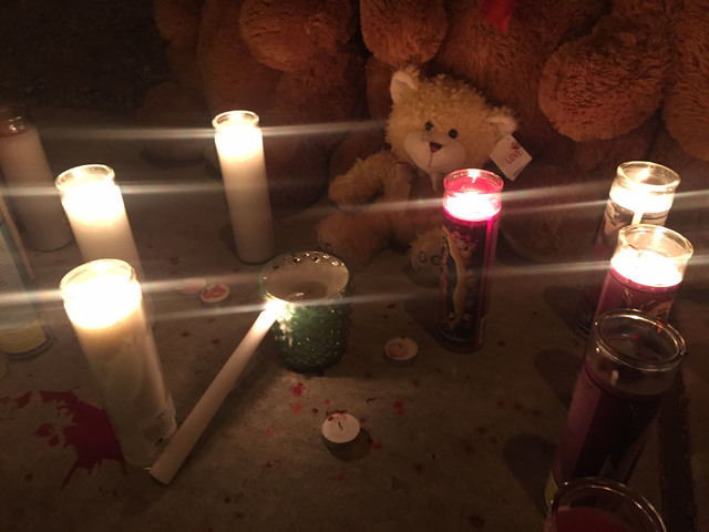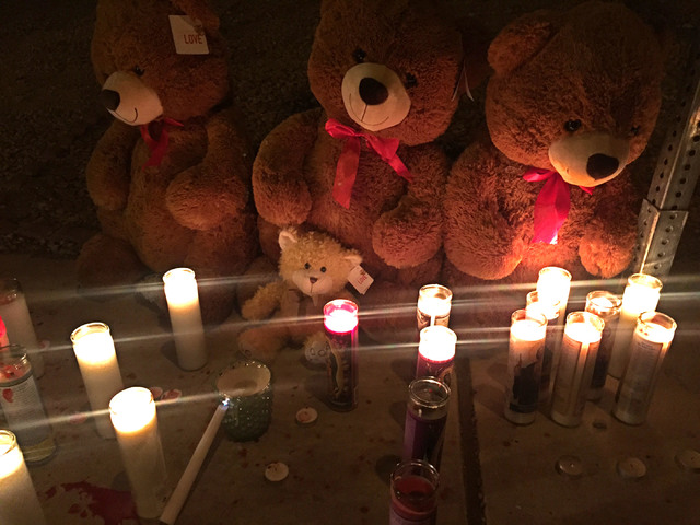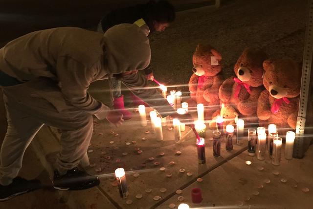The family held a vigil Sunday night at the crash site near the intersection of Allen Lane and Colton Avenue. About a dozen friends and family gathered to light candles and console each other. Three large teddy bears sat next to the candles, each representing one of the women. One small teddy bear honored Ficklin’s unborn baby.