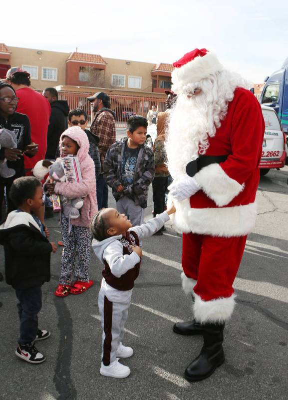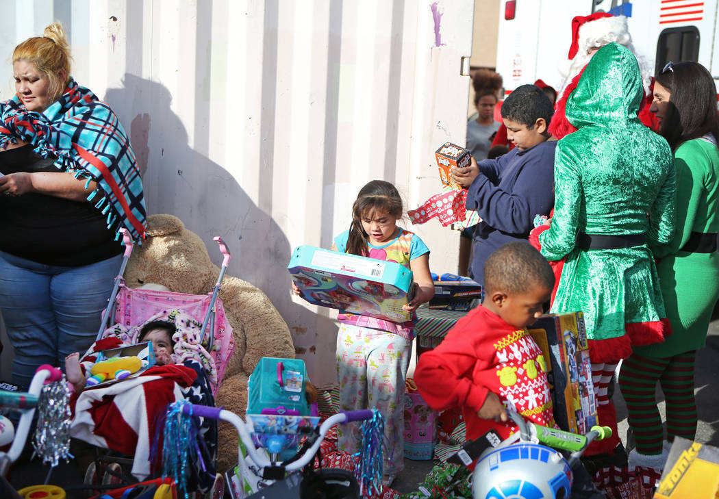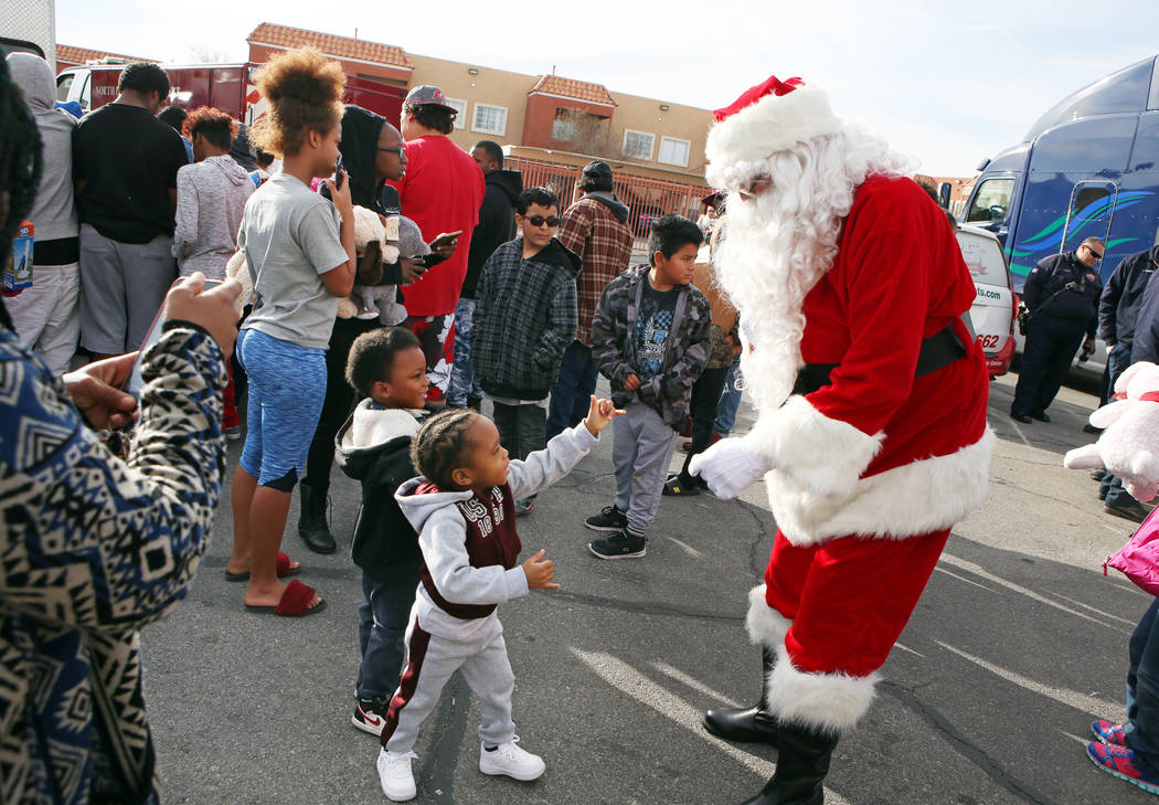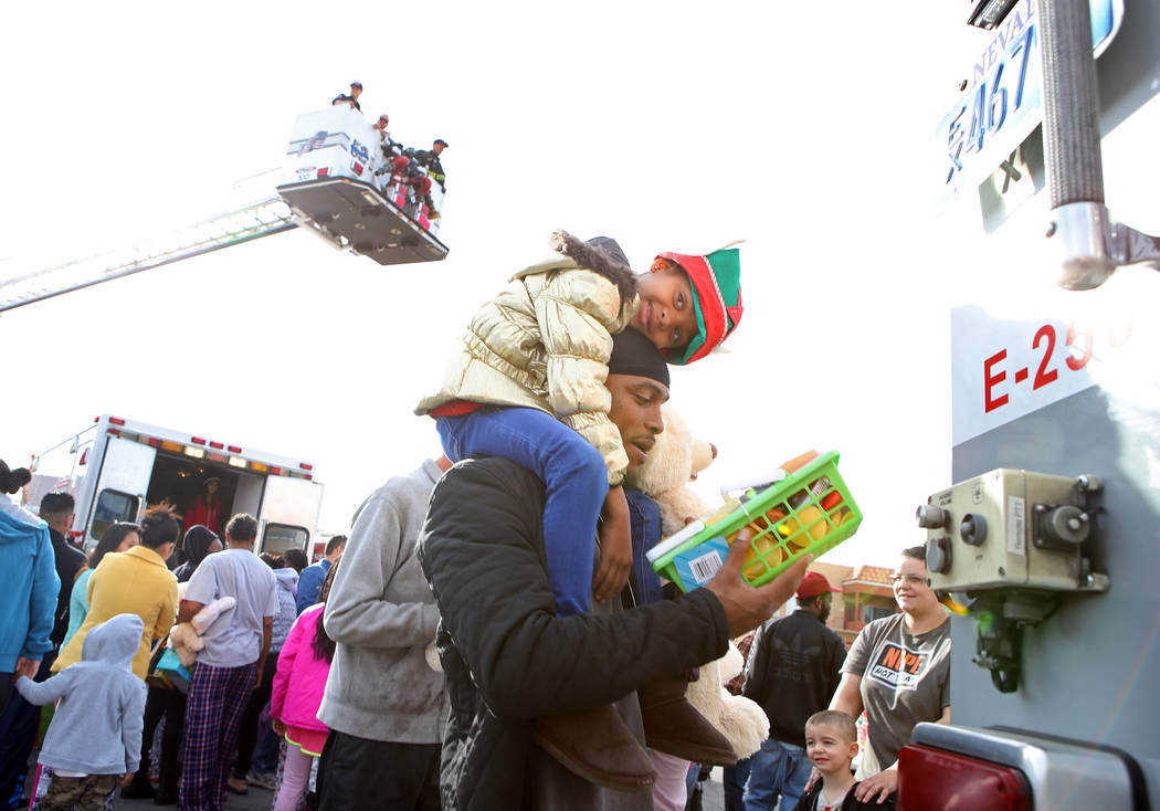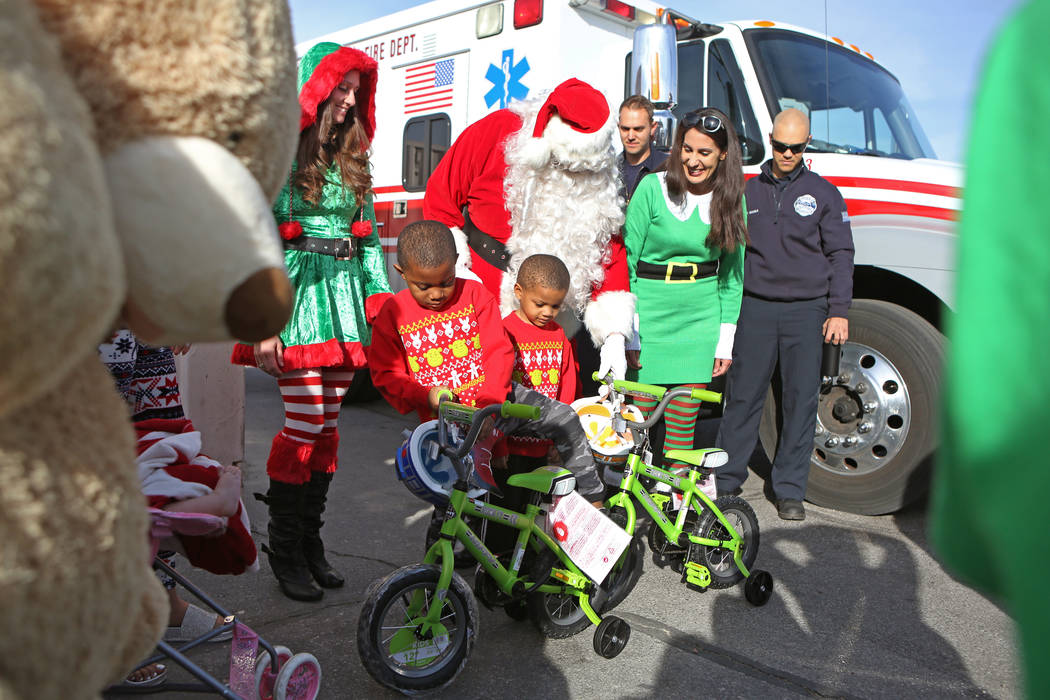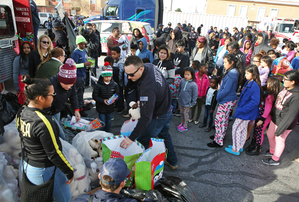 North Las Vegas Fire Capt. Sergio Reynoso, who spearheads the event, said, “Sirens on eight trucks will grab anyone’s attention, so we make sure every kid gets a gift.”