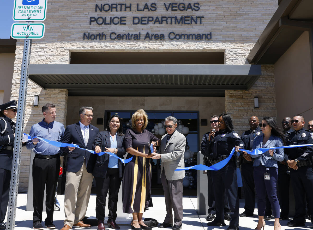 Guests, including North Las Vegas Mayor Pamela Goynes-Brown, center, Councilman Richard Cherchio, and Chief of Police Jacqueline Gravatt, second from right, participate in the ribbon-cutting ceremony for the city’s third police station, on Wednesday, May 8, 2024, in North Las Vegas. (Bizuayehu Tesfaye/Las Vegas Review-Journal) @bizutesfaye
