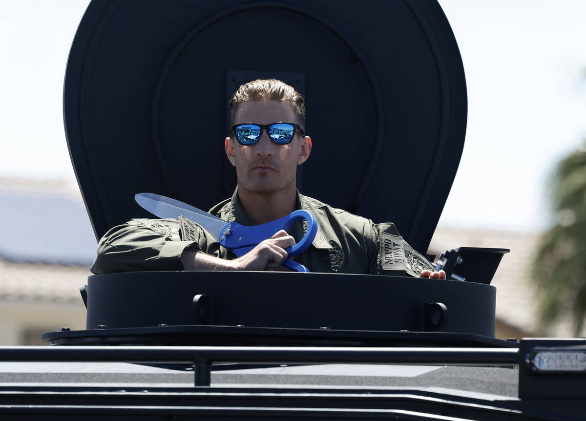 Joshua Kleintholz, a member of the North Las Vegas Police Department SWAT team, delivers giant scissors for the official opening ceremony and ribbon cutting for the city’s third police station, on Wednesday, May 8, 2024, in North Las Vegas. (Bizuayehu Tesfaye/Las Vegas Review-Journal) @bizutesfaye