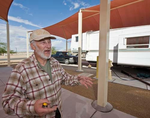 At the base of the Sheep Mountains, Rick Knopick lives in his recreational vehicle for months at a time at the Clark County Shooting Range.