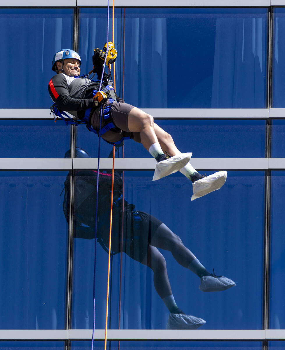 Rappeller Ted Miller with Credit One slides down from the roof at the Opal Tower at Virgin Hotels Las Vegas as Junior Achievement of Southern Nevada partners with Over The Edge as a fundraiser for its financial literacy programs for local K-12 students on Saturday, April 23, 2022, in Las Vegas. (L.E. Baskow/Las Vegas Review-Journal) @Left_Eye_Images