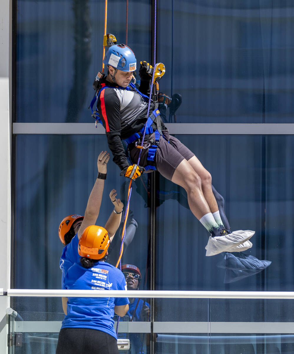 Rappeller Josh Crame with WestPac Wealth Partners eases down from the roof at the Opal Tower at Virgin Hotels Las Vegas as Junior Achievement of Southern Nevada partners with Over The Edge as a fundraiser for its financial literacy programs for local K-12 students on Saturday, April 23, 2022, in Las Vegas. (L.E. Baskow/Las Vegas Review-Journal) @Left_Eye_Images