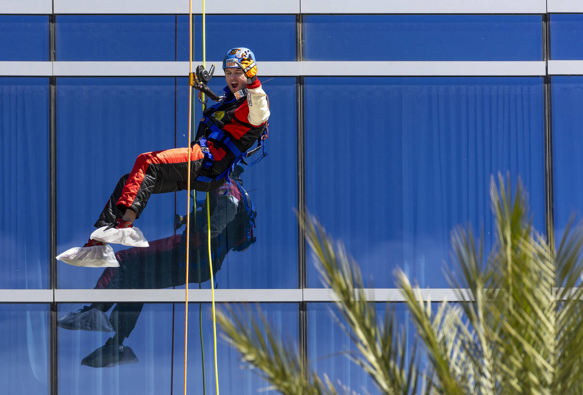 Rappeller Taylor Barton with the Las Vegas Mini Grand Prix celebrates as he slides down from the roof at the Opal Tower at Virgin Hotels Las Vegas as Junior Achievement of Southern Nevada partners with Over The Edge as a fundraiser for its financial literacy programs for local K-12 students on Saturday, April 23, 2022, in Las Vegas. (L.E. Baskow/Las Vegas Review-Journal) @Left_Eye_Images