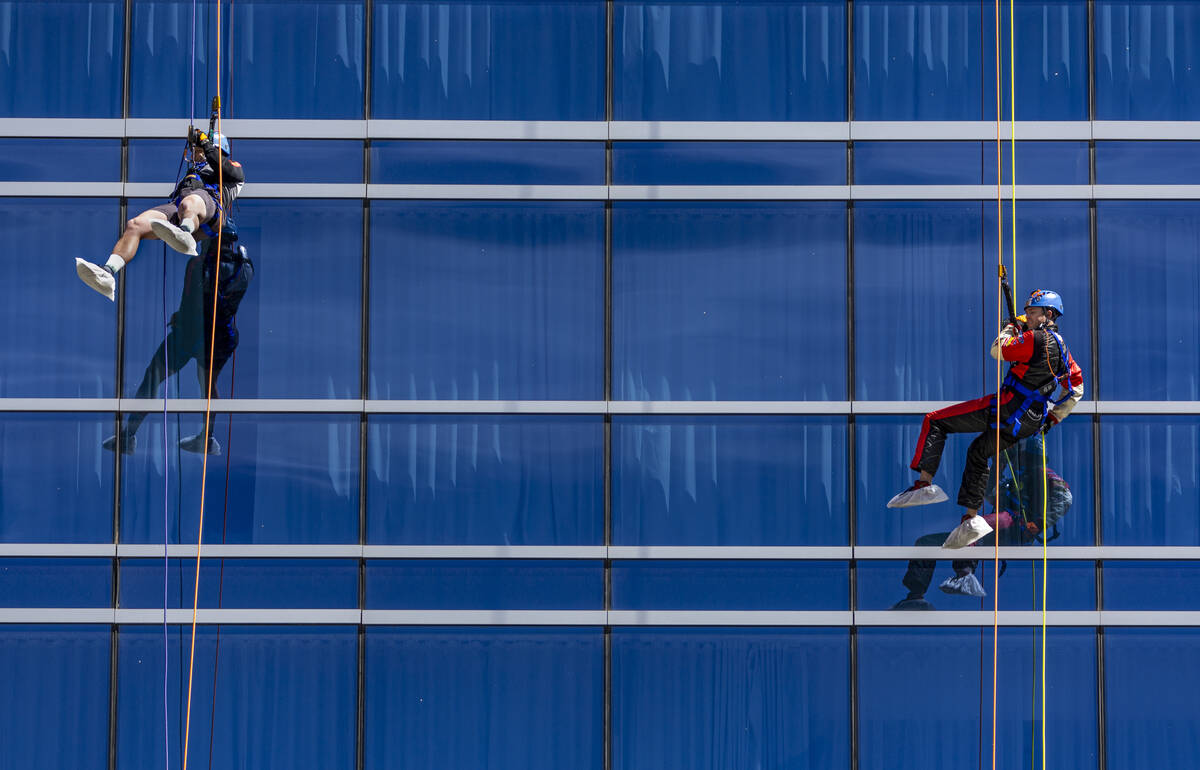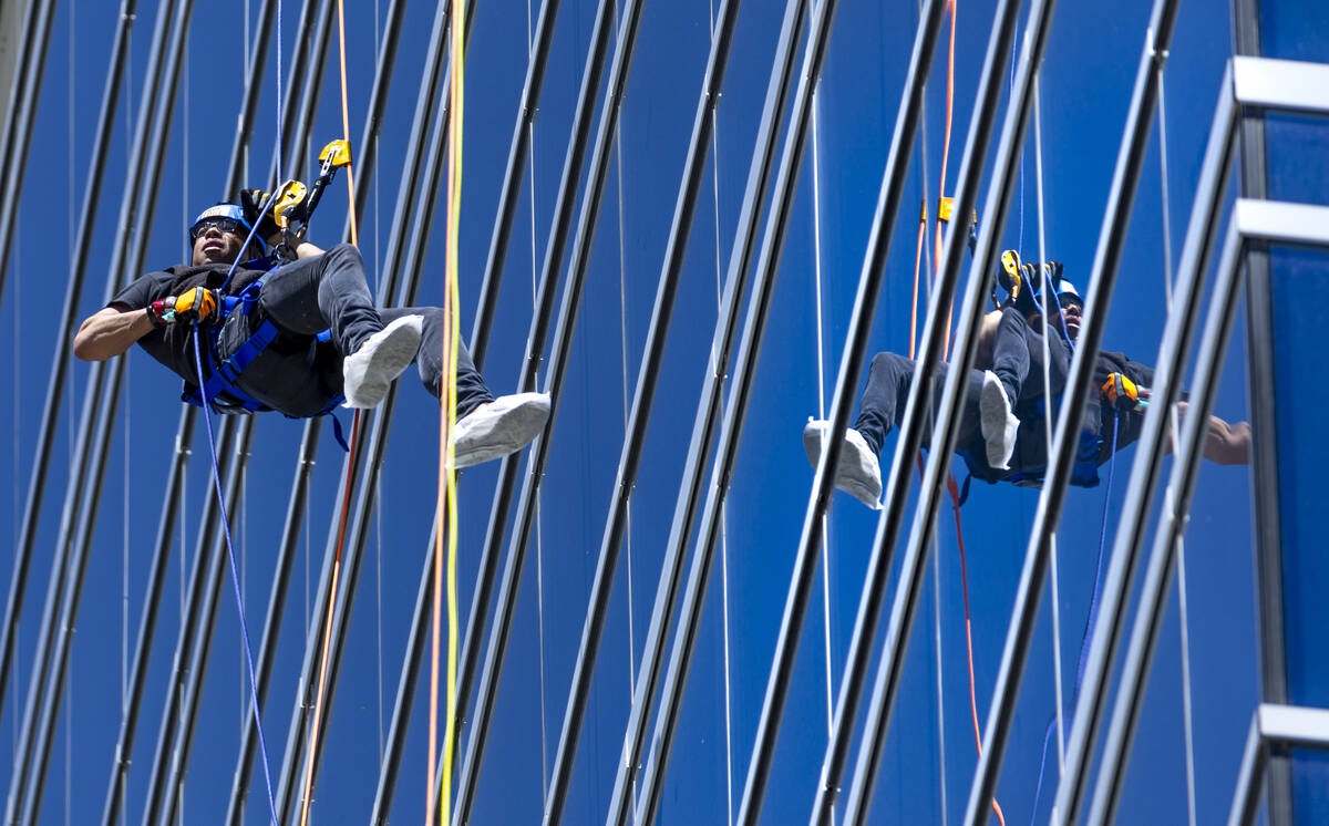 Rappellers Josh Crame with WestPac Wealth Partners, left, and Taylor Barton with the Las Vegas Mini Grand Prix slide down from the roof at the Opal Tower at Virgin Hotels Las Vegas as Junior Achievement of Southern Nevada partners with Over The Edge as a fundraiser for its financial literacy programs for local K-12 students on Saturday, April 23, 2022, in Las Vegas. (L.E. Baskow/Las Vegas Review-Journal) @Left_Eye_Images