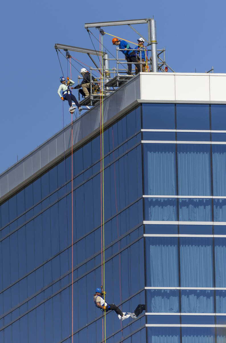 Rappellers begin to work their down from the roof at the Opal Tower at Virgin Hotels Las Vegas as Junior Achievement of Southern Nevada partners with Over The Edge as a fundraiser for its financial literacy programs for local K-12 students on Saturday, April 23, 2022, in Las Vegas. (L.E. Baskow/Las Vegas Review-Journal) @Left_Eye_Images