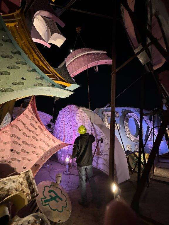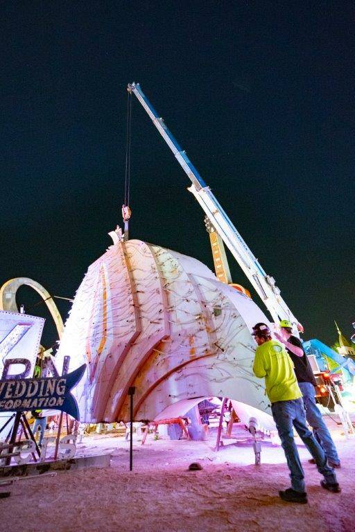 A large portion of a 1970s Flamingo Hotel & Casino sign is moved by crane on Tuesday, Jan. 30, 2024. It was moved from a sign storage area at The Neon Museum for restoration and will be placed with the restored vintage signs later in 2024. (The Neon Museum)
