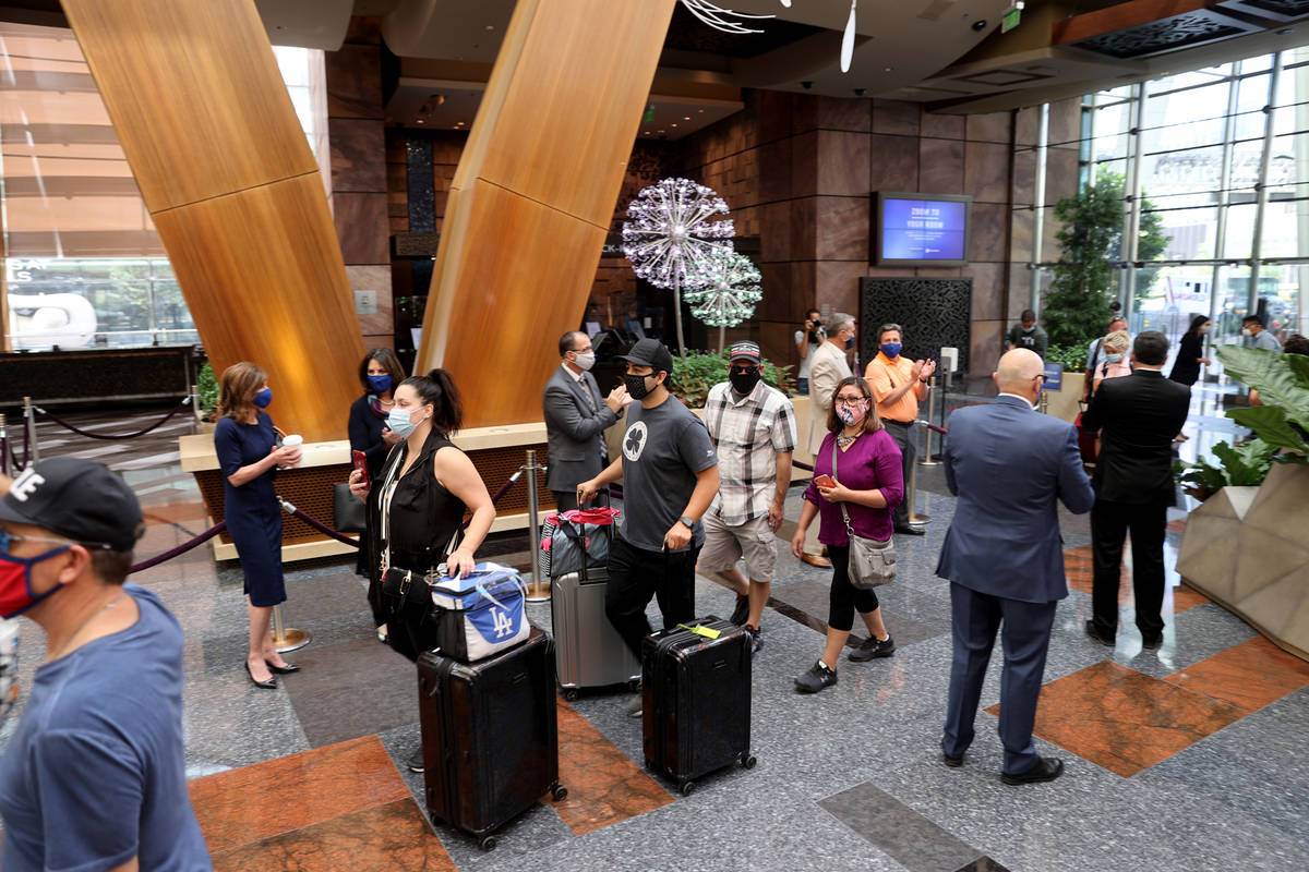 Guests check in Mandalay Bay on the Strip in Las Vegas upon reopening Wednesday, July 1, 2020. (K.M. Cannon/Las Vegas Review-Journal) @KMCannonPhoto